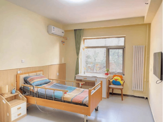 老人房间设施:护理床、呼叫器、储物柜、床头灯、电视、空调、冰箱、电话、独立卫生间、热水器、洗衣机、采暖、新风系统、智能监测设备、书桌