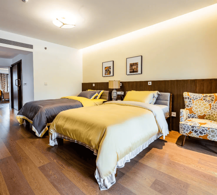 设施方面,公寓总面积达五千余平米,紧邻世界之花商业综合体与石榴公园,地理位置优越。内部采用适老化居家设计,兼顾公共活动空间与老人隐私,设有单人间、双人间、家庭套间等多种房型,其中家庭间可接收两老一残家庭,实现老人与智残子女同护。公寓配备全新风PM2.5循环过滤系统、LG静音地面、智能马桶等先进设施,电梯直达700平米屋顶生态花园,让长者轻松亲近自然。