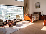 适老化设施贯穿机构每一个角落,从居住空间到公共区域,全方位保障长者安全与舒适。居住房型多样,单人间28-70平米,双人间38平米,均配备PVC防滑地胶、L型扶手、圆角家具,电梯内设盲文按钮及语音播报,卫生间紧急呼叫响应时间≤30秒。公共区域涵盖300平米屋顶阳光花房、200平方米中央庭院、康复运动花园等,种植银杏、连翘等药用植物,负氧离子浓度达1800个/cm³,为长者提供自然舒适的活动空间。康复治疗室配备各类康复、理疗、语言训练、吞咽训练设备,满足不同康复需求,让长者在院内即可享受专业康复服务。