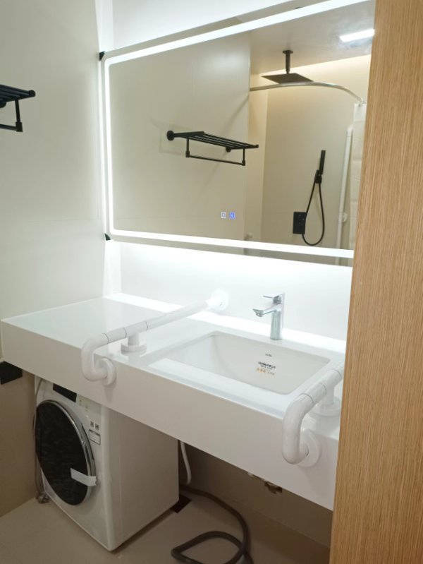 户型设计充分尊重长者的居住习惯和需求,推出70㎡、40㎡、32㎡等多种户型选择,可满足单人、双人等不同居住需求,所有户型均采用南北通透的设计,采光充足、通风良好,室内空间宽敞明亮,避免压抑感,同时预留足够的活动空间,方便长者行走和轮椅周转。所有户型均配备全方位的适老化细节配置:卫生间配备安全扶手(洗手台旁、马桶旁、淋浴区),有效预防长者跌倒,无高差淋浴区搭配防滑地胶,进一步提升安全性,同时配备恒温花洒,避免水温过高或过低烫伤长者;家具全部采用圆角设计,避免长者碰撞受伤,桌椅高度适配长者坐姿,方便长者起身,家具底部预留扫地机器人通行空间,方便清洁;配备应急电源和感应起夜灯,夜间起床自动亮起,无需摸索,既安全又便捷,应急电源可在突发停电时保障长者的基本用电需求;衣柜配备下拉式衣杆,高度适宜,方便长者取用衣物,无需弯腰费力,橱柜采用地柜内退设计,避免长者磕碰,同时预留轮椅操作空间,适配半失能、失能长者的使用需求;部分户型还专门预留了轮椅收纳区,并配置专业护理床,护理床可根据长者需求调节高度、角度,方便长者起身、翻身,减轻照护负担,全方位适配半失能、失能长者的居住需求。