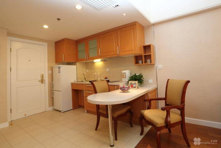 设施特色十分突出,高低错落的建筑布局能引入更多阳光与绿意,5000平米中庭绿地、全天开放的屋顶花园,为老人提供了充足的户外活动与休闲空间。居室内配备古典家具、电动升降沙发、橱柜、冰箱、电热水壶,独立卫生间内设有整体淋浴房、高档卫生洁具及智能温水洗净烘干抗菌坐便器,24小时提供饮用水与生活热水,细节处尽显贴心。每个楼层均设有开放厨房、起居室,方便老人交流互动;同时配备交谊室、图书室、手工艺室、舞蹈室、乒乓球室、台球室、电脑教室、多功能厅及儿童娱乐区,兼顾老人的休闲、学习与亲情互动需求。