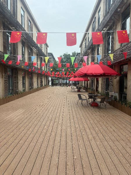 设施特色:主楼共三层,二层、三层为病房区域,一层为医生办公、行政办公及活动室、会议室。整体装修古色古香,融入中国古典园林元素,小桥流水、花台鱼池、廊檐石阶、古钟佛像错落其间,氛围静谧雅致,让人仿佛置身疗养院而非医院,有效缓解长者及家属的心理压力。