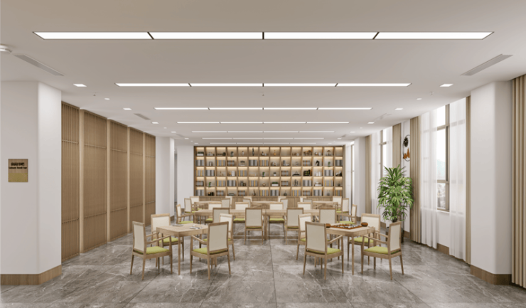 公寓配套完善,适老设施全覆盖,房间内暖光源、防滑扶手、呼叫系统等设备一应俱全,24小时热水供应,保障长辈居住舒适与安全;自助餐厅、阅览区、花园等区域,为长辈提供休闲放松的空间。